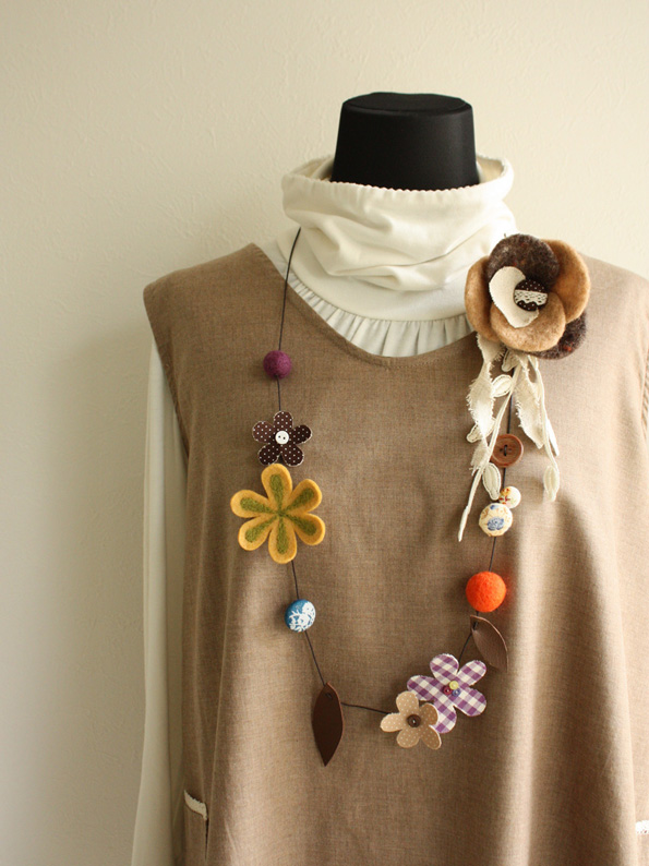羊毛といろいろな素材を組み合わせたロングネックレスです。