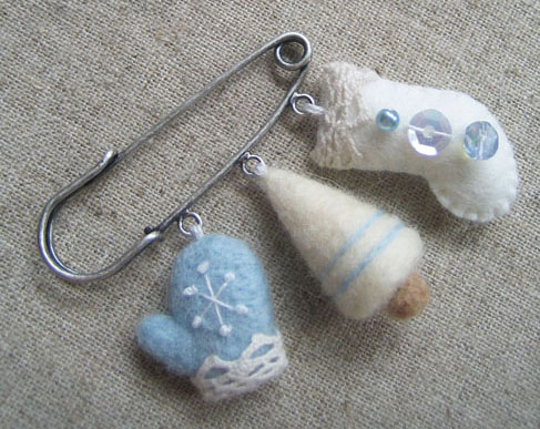 小さな冬のチャームが3つ並んだブローチ。
