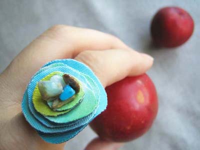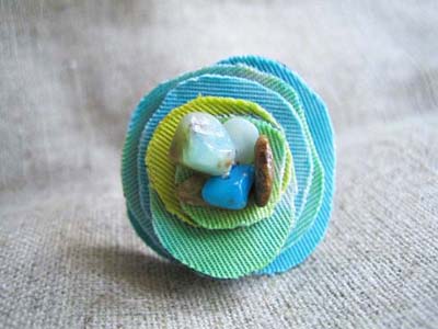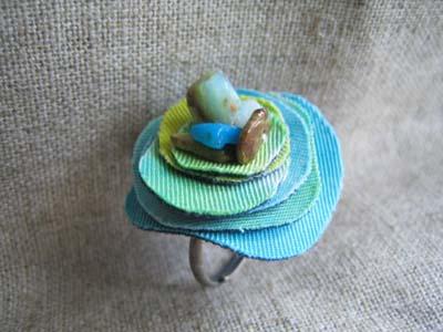 このゆびわ、作り方はとてもカンタンです。ランダムな丸型に布を切って重ねるだけ。