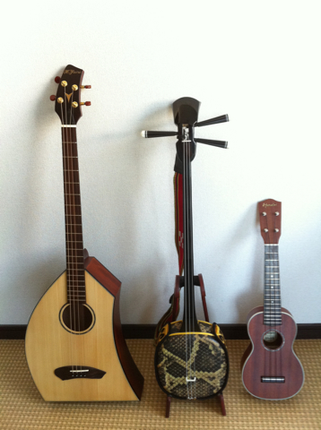 右からウクレレ、三線。
