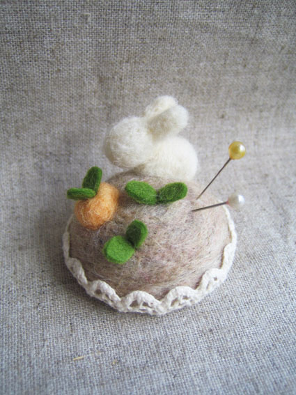 こんなマスコットみたいな針山を作れるのは羊毛フェルトならでは。